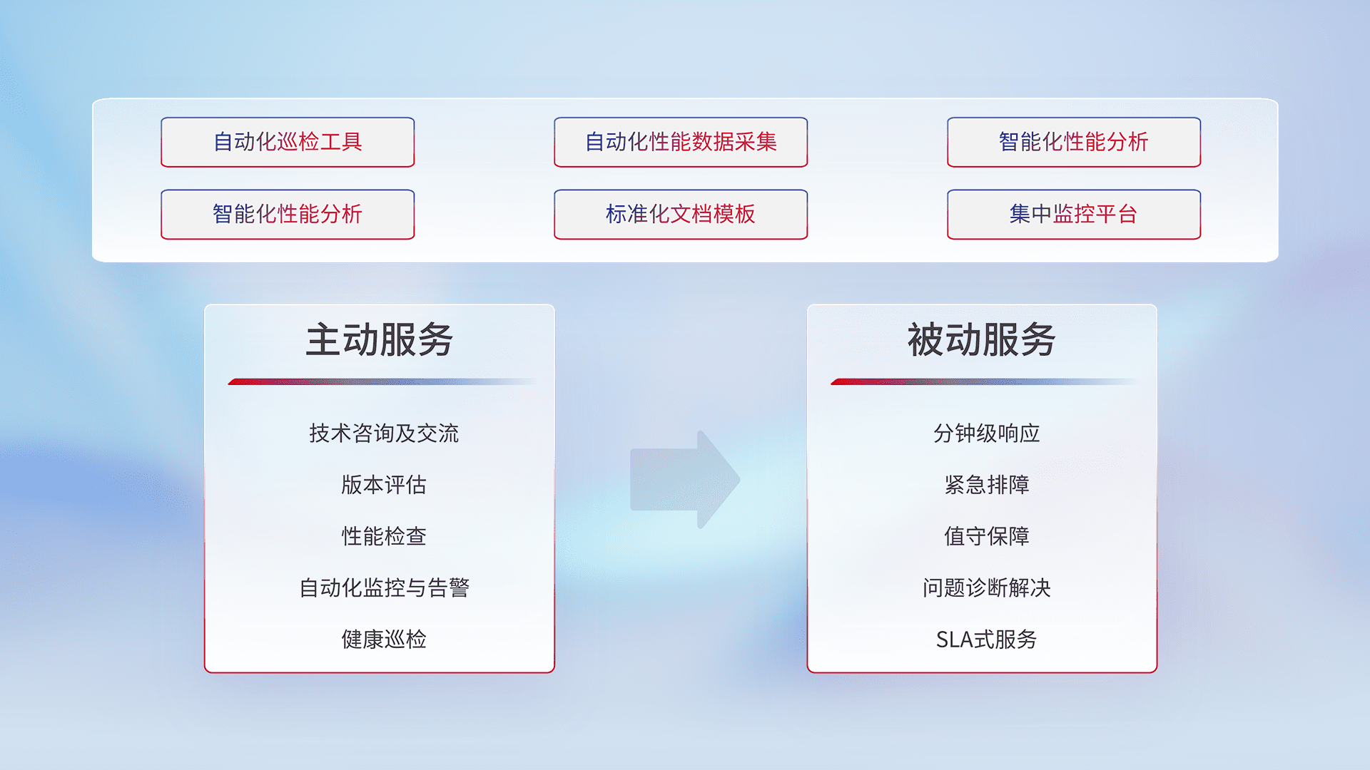 智能化工具和标准化文档,,保障服务质量,,,提供主动服务(包含技术咨询、、版本评估、、性能检查、、、自动化监控与告警、、健康巡检)和被动服务包含(分钟级响应、、紧急排障、、、、值守保障、、问题诊断解决、、、、SLA服务)。。。。