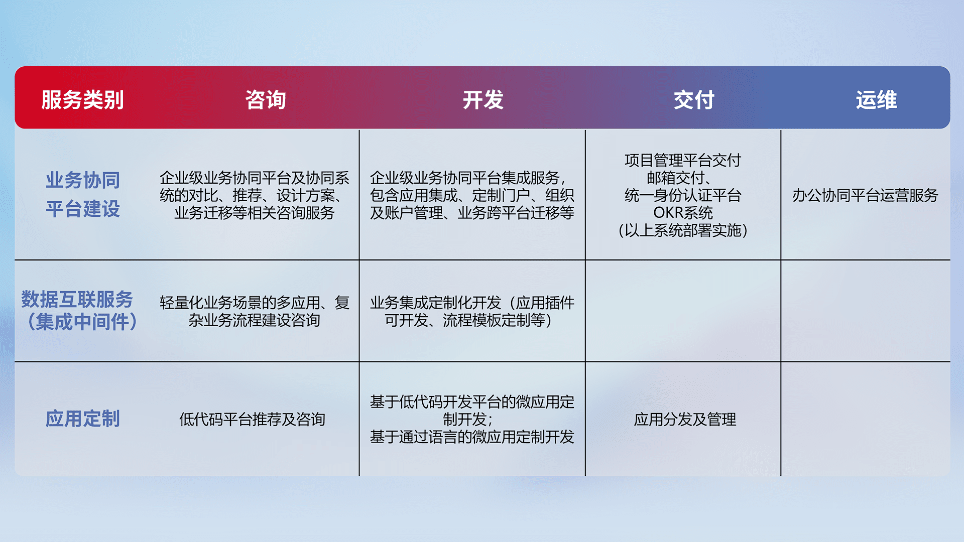 针对钉钉、、企微、、、IDaas等平台级产品提供产品的规划、、、方案、、、、交付、、、、定制化开发等服务,,,实现如统一协同办公、、、、智能客户服务、、、、混合会议管理、、智能数据查询、、、、等业务场景,,,实现数字化转型。。。。